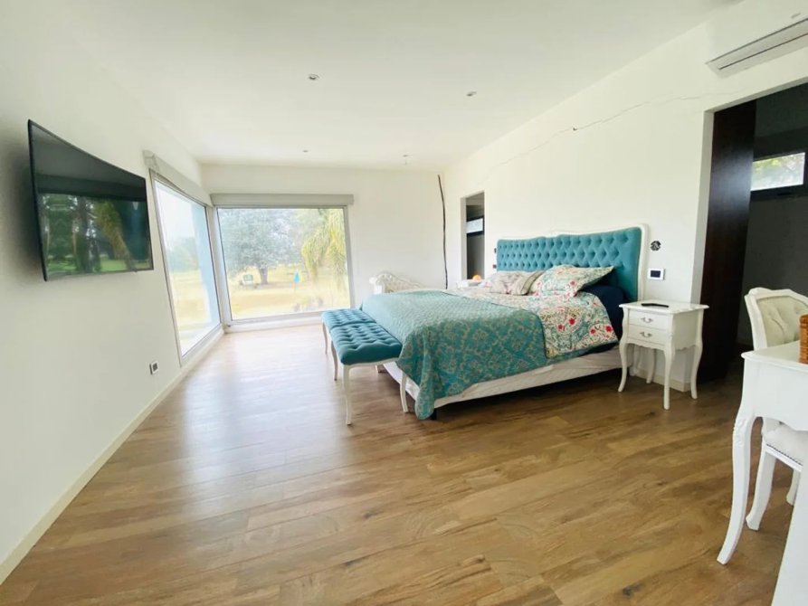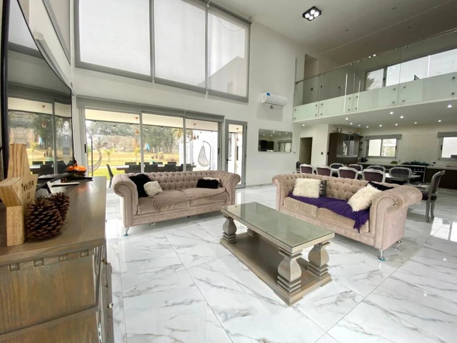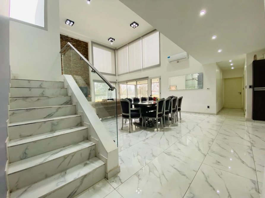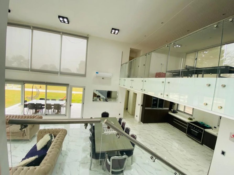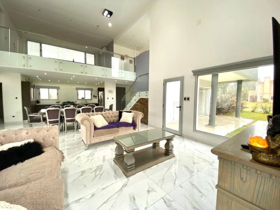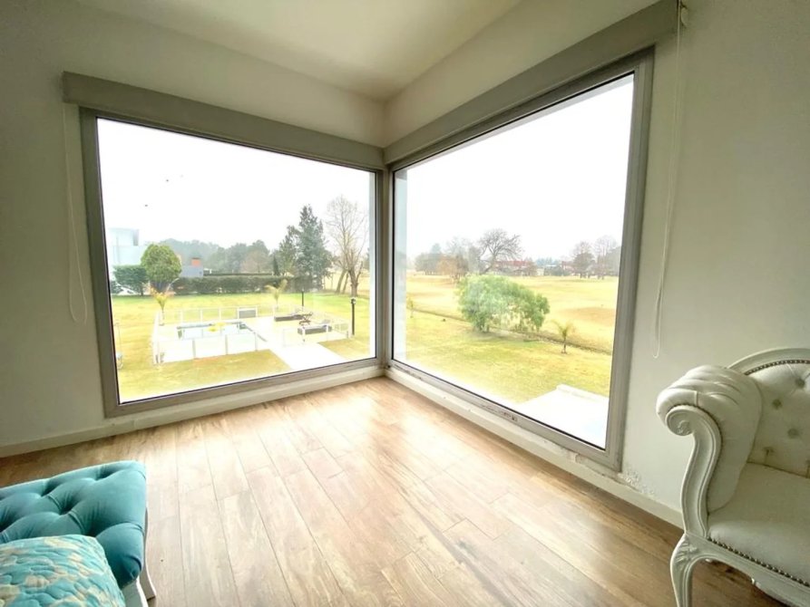 La casa se desarrolla en dos plantas, ingresando por el living comedor, doble altura con amplios ventanales todos con vista abierta al golf. Pisos de Mármol de carrara. Cocina integrada con muebles de primera marca y horno industrial. Un toilette también con revestimientos de mármol, manteniendo el mismo estilo de la planta baja. Incluye a continuación un amplio dormitorio con doble placard espejado, en suite, revestido en madera. Cuenta también con lavadero y un amplio Garage cubierto para dos-tres autos con portón automático.