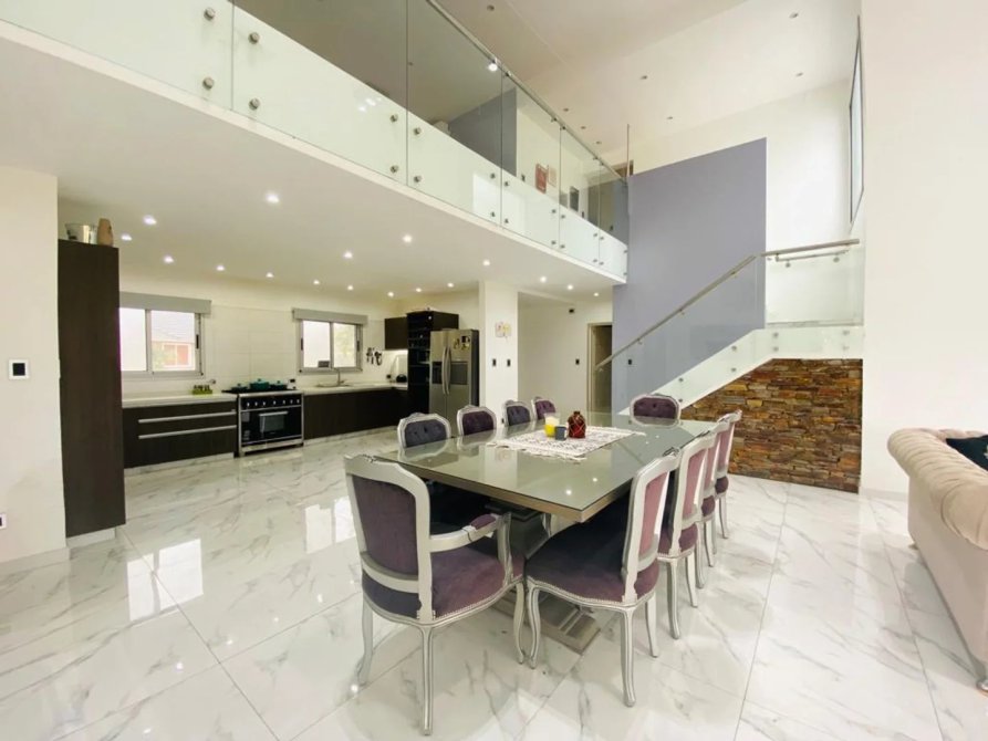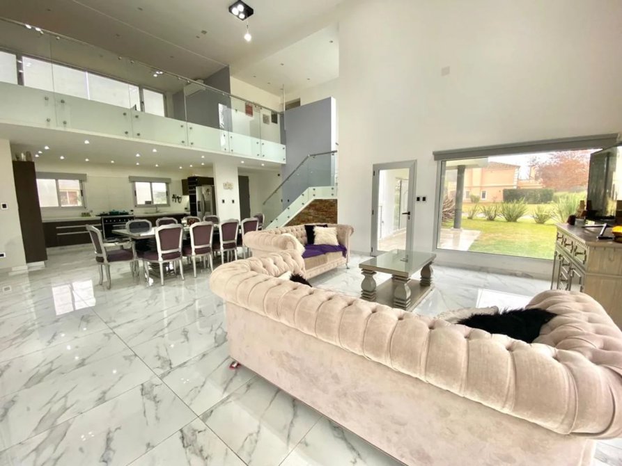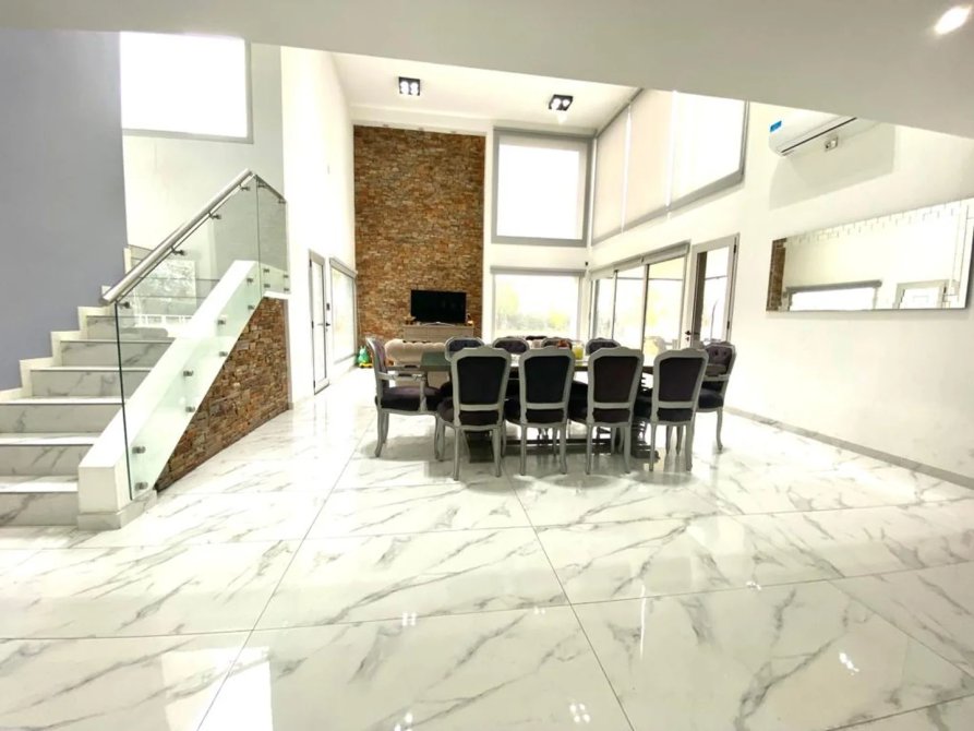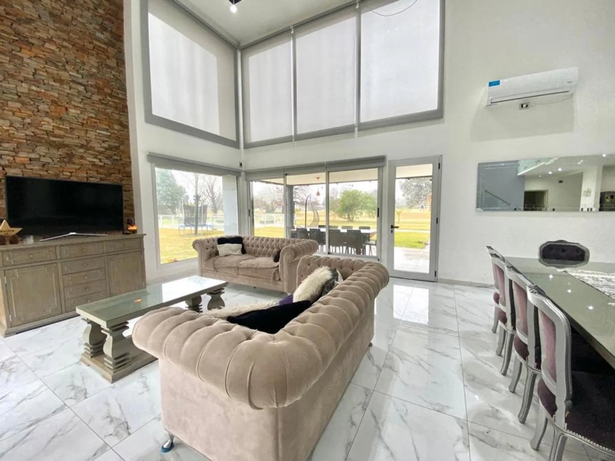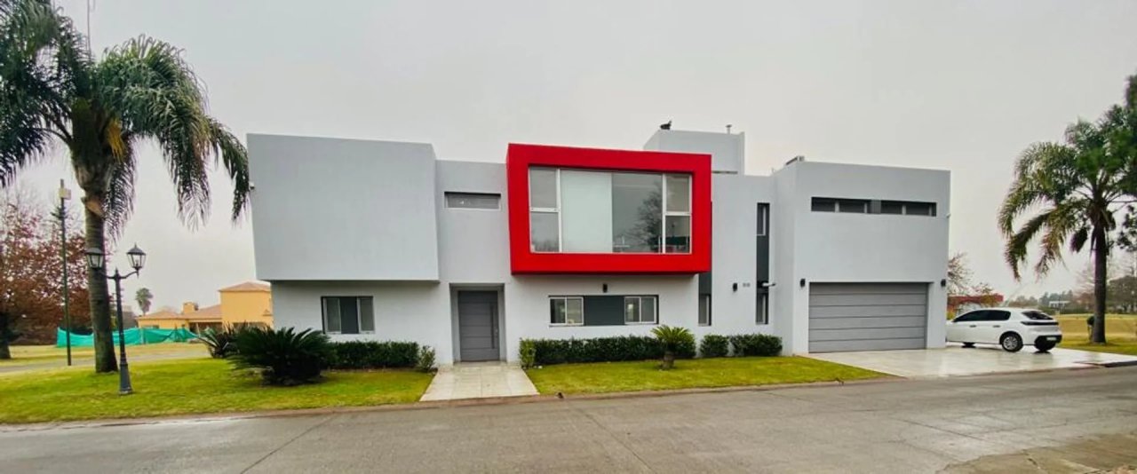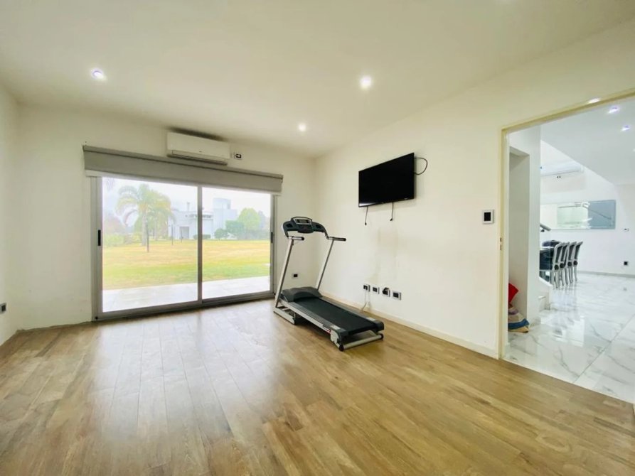 La casa se desarrolla en dos plantas, ingresando por el living comedor, doble altura con amplios ventanales todos con vista abierta al golf. Pisos de Mármol de carrara. Cocina integrada con muebles de primera marca y horno industrial. Un toilette también con revestimientos de mármol, manteniendo el mismo estilo de la planta baja. Incluye a continuación un amplio dormitorio con doble placard espejado, en suite, revestido en madera. Cuenta también con lavadero y un amplio Garage cubierto para dos-tres autos con portón automático.