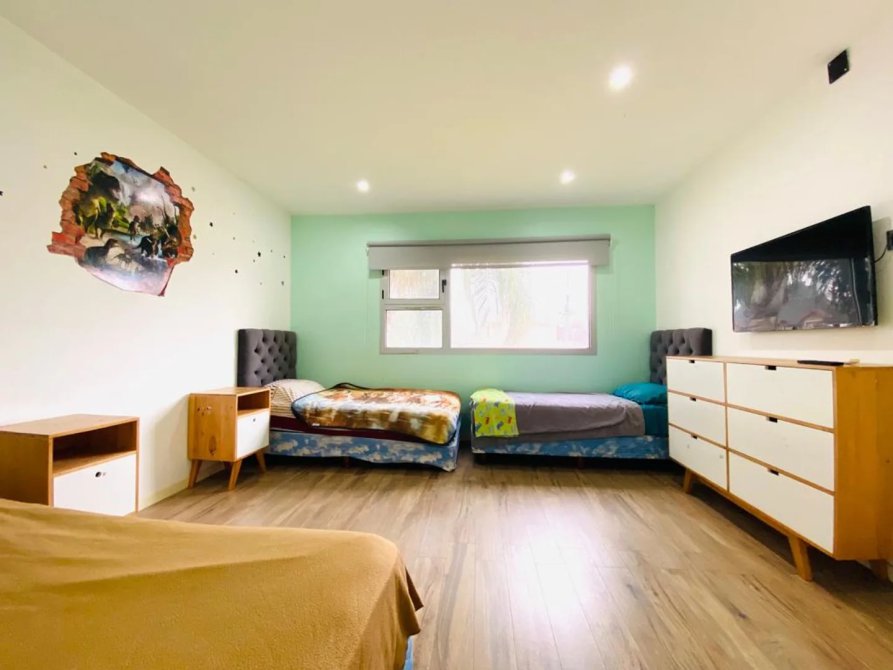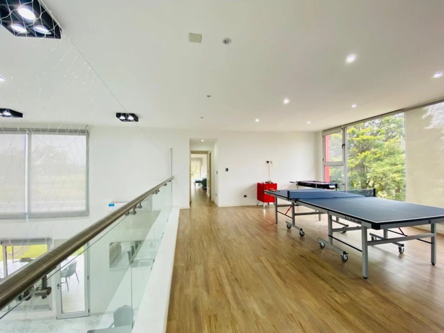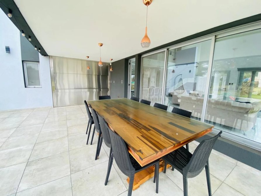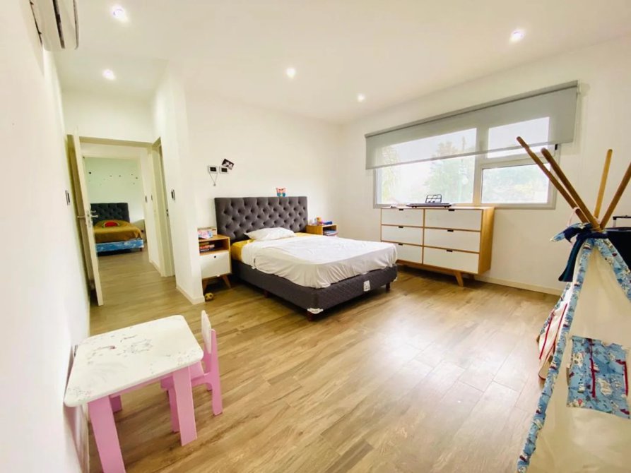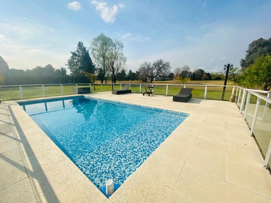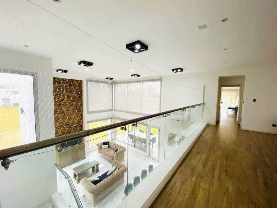 En la PLANTA ALTA encontramos un amplio playroom, con red de protección para niños. En una de las alas se halla la habitación principal ,con vestidor y una inmejorable vista en altura al campo de golf y piscina de la casa, su baño cuenta con doble bacha. En la otra ala superior se encuentran los dos amplios dormitorios, con sus respectivos baños completos. Desde el living comedor, se accede a la galería que incluye una imponente parrilla toda revestida en acero inoxidable recientemente realizada.