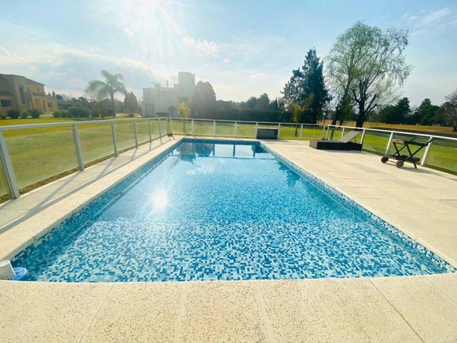 Desde ahí el camino nos lleva a la zona del solarium que incluye una hermosa piscina de venecitas con luces, con vista abierta al campo de golf.